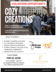 Clyopatra Winery is partnering with The Nubian Circle for Cozy Creations a hands-on volunteer experience where we’ll create blankets and scarves for those in need this winter.