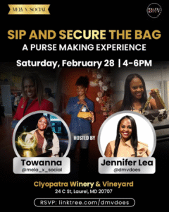 Clyopatra Winery is teaming up with Mela X Social for Sip & Secure The Bag—hosted by Towanna (@mela_x_social) and Jennifer Lea (@dmvdoes). Sip while you design your own custom purse experience.